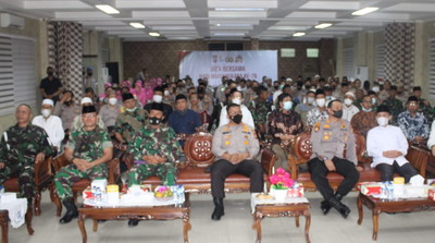 Pekanbaru, Detaksatu : Komandan Kodim (Dandim) 0301/Pekanbaru Kol. Inf Nur Rohman Zein, SE.,MM, diwakili Mayor Arm Luud Guntono menghadiri doa bersama memperingati Hari Ulang Tahun (HUT) ke 76 Bhayangkara, bertempat di aula Zapin di Aula Mako Polresta Pekanbaru, Jumat (1/7/2022) Malam.