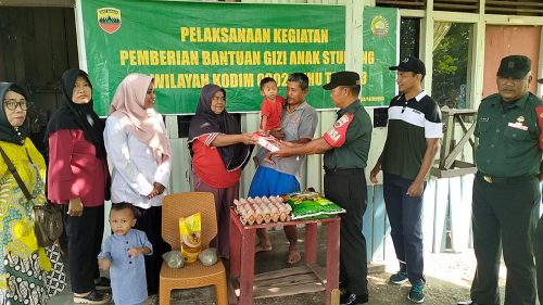 Inhu, Detaksatu – Babinsa Koramil 04/Pasir Penyu untuk menurunkan angka Stunting di wilayah binaannya Serka Rahmad Sembiring bersama Serda Dili Andika memberikan bantuan sembako dan tambahan gizi kepada anak yang beresiko Stunting di kelurahan Kembang Harum Kecamatan Pasir Penyu Kabupaten Inhu, Rabu 20 Desember 2023.