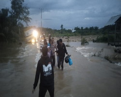 Sampai laporan ini dibuat Kondisi Air Sungai / banjir masih menggenangi jalan Poros dan rumah warga, Korban Jiwa Nihil.