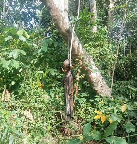 Saat ditemukan kondisinya masi tergantung, namun sudah tidak utuh. Kaki dan tangannya sudah ada lepas, rahang bawah hampir lepas, rambut lepas karena kulit kepala sudah terkelupas.