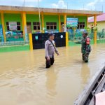 Inhu, Detaksatu – Babinsa Kodim 0302/Inhu Koramil 04/Pasir Penyu Koptu Edi Winarjono memantau Desa binaannya yang terkena banjir meluapnya Sungai Kuantan akibat
