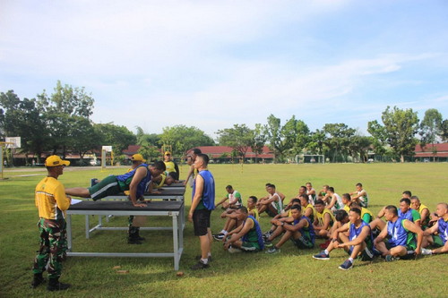 Sebelum melaksanakan jasmani, seluruh Personel terlebih dahulu melaksanakan pengecekan tensi oleh Tim kesehatan dari Rumah Sakit Tentara Tingkat IV.01.07.04 Pekanbaru, pemeriksaan tinggi dan berat badan serta dilanjutkan senam pemanasan.