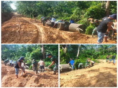 Dandim 0302/Inhu Letkol Inf Emick Chandra Nasution, M.P.M melalui Danramil 04/Pasir Penyu Kapten Inf Bambang Kosasih Tarigan mengatakan Tahap Penimbunan jalan yang dilakukan oleh anggota Satgas TMMD sudah tersedia material berupa Buis Beton untuk Gorong-gorong.