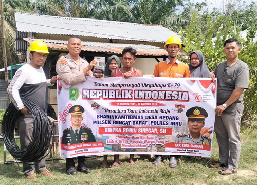Inhu, Detaksatu.com : Dalam rangka memeriahkan Hari Kemerdekaan Republik Indonesia (RI), Bhabinkamtibmas Redang memberikan penerangan listrik gratis kepada masyarakat Desa Redang pada Selasa pagi (13/08/2024).