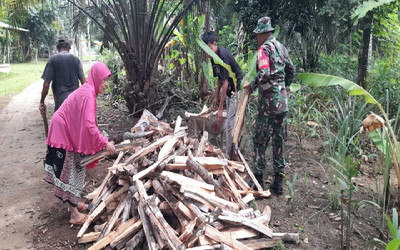 Babinsa yang hadir saat itu dengan penuh semangat langsung membantu warga mengangkat kayu bakar yang sudah di belah dan disiapkan menggunakan angkong menuju lokasi rumah untuk di susun agar cepat kering.