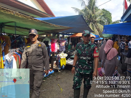 Batang Tuaka – Dalam rangka menjaga situasi keamanan dan ketertiban masyarakat (Kamtibmas), Babinsa Koramil 12/Batang Tuaka, Sertu Januar, melaksanakan kegiatan patroli pengamanan pasar bersama Satuan Polisi Pamong Praja (Satpol PP) pada Kamis, 9 Oktober 2025, pukul 08.00 WIB. Kegiatan ini difokuskan di area pasar tradisional Batang Tuaka yang menjadi pusat aktivitas ekonomi warga.