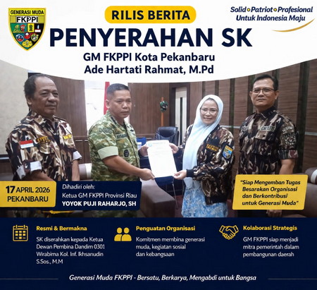 Penyerahan SK tersebut dilakukan langsung kepada Ketua Dewan Pembina Dandim 0301/Wira Bima, Kolonel Infanteri Ikhsanudin, SSos, MM, serta disaksikan oleh Ketua GM FKPPI Provinsi Riau, Yoyok Puji Raharjo, SH, dalam sebuah pertemuan resmi yang berlangsung pada Jumat (17/04/2026).