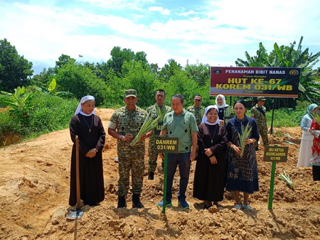 Pekanbaru detaksatu : Babinsa Kelurahan Umban Sari, Koramil 01/Rumbai, Pelda Juli Hendra Ismail memonitor kegiatan syukuran dan penanaman bibit nanas dalam rangka Hari Ulang Tahun (HUT) ke-67 Korem 031/Wira Bima di SLB Santa Lusia, Jalan Umban Sari Atas RT 03 RW 12, Kecamatan Rumbai, Kota Pekanbaru, Jumat (17/4/2026).